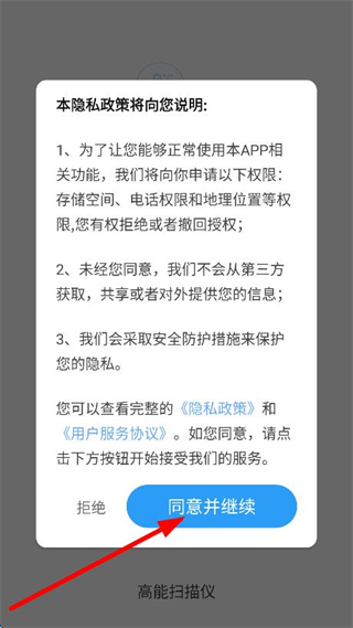 1、在隱私政策彈窗中,點(diǎn)擊同意并繼續(xù),進(jìn)入APP首頁(yè)。