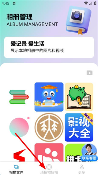2、在APP首頁(yè),點(diǎn)擊底部動(dòng)植物掃描,進(jìn)入動(dòng)植物識(shí)別頁(yè)面。