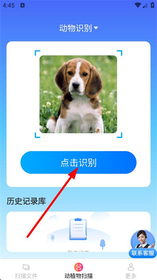 3、在動(dòng)植物識(shí)別頁(yè)面,點(diǎn)擊點(diǎn)擊識(shí)別,進(jìn)入拍攝識(shí)別頁(yè)面。
