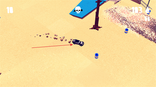 3、駕駛車輛躲避帶有骷髏標(biāo)記的危險(xiǎn)區(qū)域,同時(shí)收集藍(lán)色水桶等資源,維持生存。