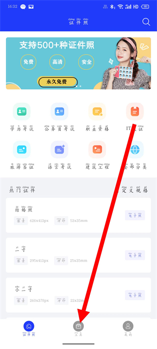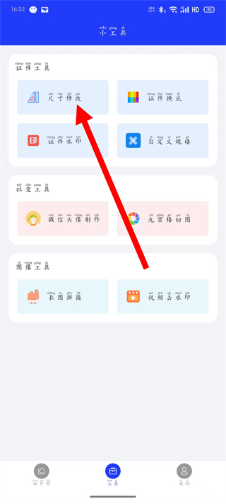 1、打開全能證件照大師,點(diǎn)擊底部工具選項(xiàng),進(jìn)入工具功能頁面。