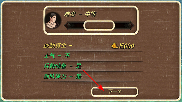 1、進入游戲難度設置界面后,點擊下一個按鈕,這是推進開局配置的關鍵操作,點擊后可確認難度、啟動資金等設置,開啟游戲進程。
