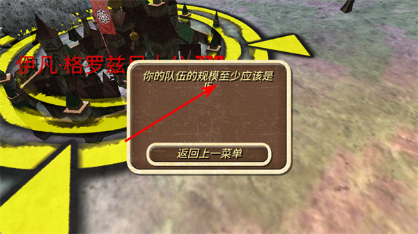 3、若出現(xiàn)隊伍規(guī)模至少10的提示,點擊返回上一菜單按鈕,這是調整隊伍配置的關鍵步驟,需招募士兵擴充隊伍,滿足后續(xù)操作條件。