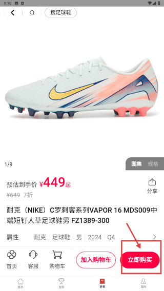 4、在商品詳情頁,點(diǎn)擊立即購買按鈕,完成該足球鞋商品的購買操作。