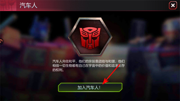 2、在汽車人陣營介紹界面,點擊加入汽車人按鈕,這是正式加入陣營的核心操作,點擊后可進入汽車人陣營的游戲進程。