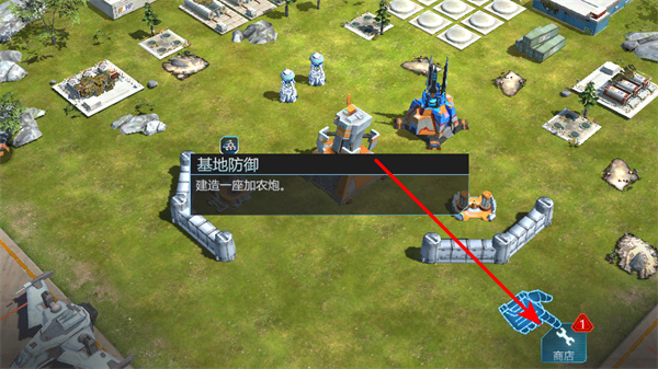 4、在基地建設界面,點擊商店按鈕,這是獲取建筑資源與防御設施的基礎操作,進入商店后可購買加農炮等防御建筑,提升能力。