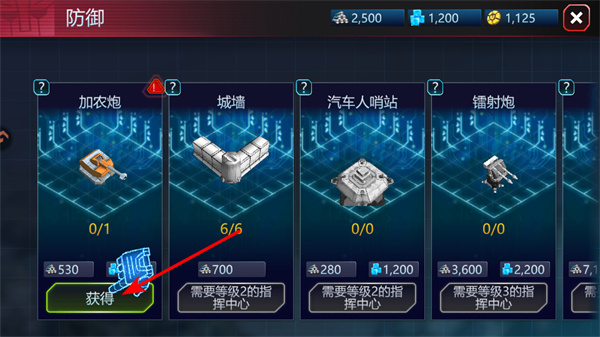 2、在防御建筑列表中,點(diǎn)擊加農(nóng)炮的獲得按鈕,這是建造加農(nóng)炮的核心操作,消耗對(duì)應(yīng)資源后可在基地部署加農(nóng)炮,提升防御能力。