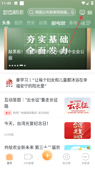1、打開起點(diǎn)新聞,點(diǎn)擊頁面右上角TV圖標(biāo),可進(jìn)入陜臺節(jié)目播放頁面。