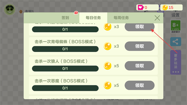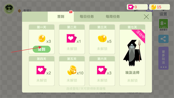 1、點擊右上角簽到按鈕,每日簽到可以獲取金幣以及生命條。