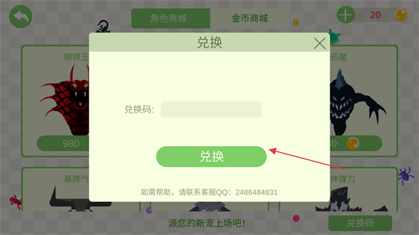 4、在游戲商城點擊右下角的兌換碼,輸入金幣兌換碼可以兌換金幣。