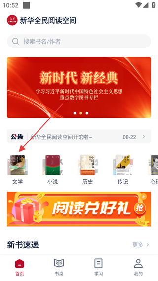 1、打開(kāi)全民閱讀空間,點(diǎn)擊文學(xué)分類(lèi),可進(jìn)入文學(xué)類(lèi)全部圖書(shū)頁(yè)面。