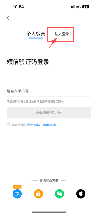 3、在登錄方式選擇界面,點(diǎn)擊法人登錄選項(xiàng),進(jìn)入法人登錄頁(yè)面。