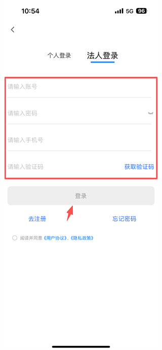 4、在法人登錄頁(yè)面,依次輸入賬號(hào)、密碼、手機(jī)號(hào),點(diǎn)擊獲取驗(yàn)證碼并輸入驗(yàn)證碼后,點(diǎn)擊登錄按鈕,完成法人登錄操作。