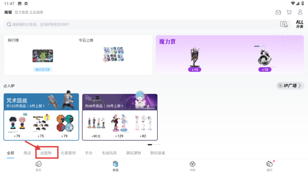 1、打開動(dòng)漫周邊類應(yīng)用,點(diǎn)擊底部商城選項(xiàng),進(jìn)入商城頁面。