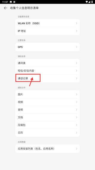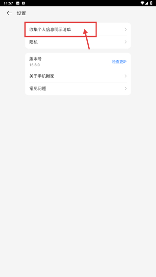 2、在設(shè)置頁(yè)面,點(diǎn)擊收集個(gè)人信息明示清單選項(xiàng),進(jìn)入信息清單頁(yè)面。