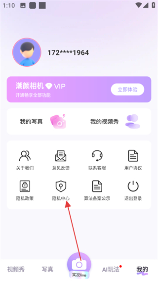 2、在個(gè)人中心頁面,點(diǎn)擊隱私中心可進(jìn)入隱私中心頁面。