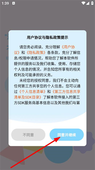 1、在用戶協(xié)議與隱私政策提示彈窗中,點擊同意并繼續(xù),進入APP主界面。