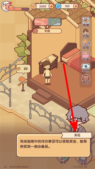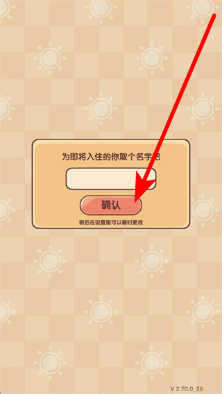 1、進入后先為角色取名,點擊確認后開啟旅程,初始會來到破舊平房,跟隨指引點擊家具可開啟裝修流程。