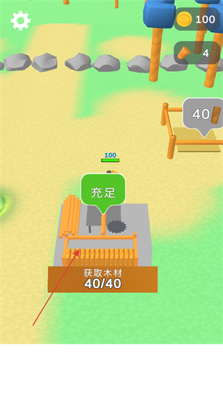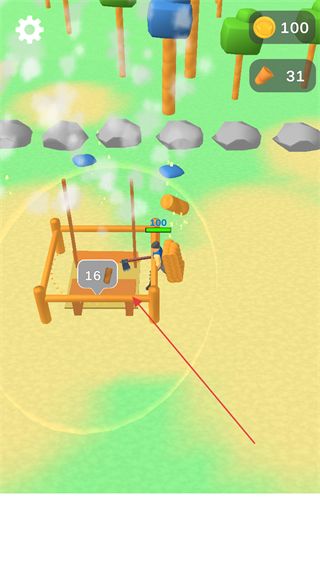1、操控角色砍樹獲取木材,積累木材數(shù)量如顯示的40/40、31、16等。