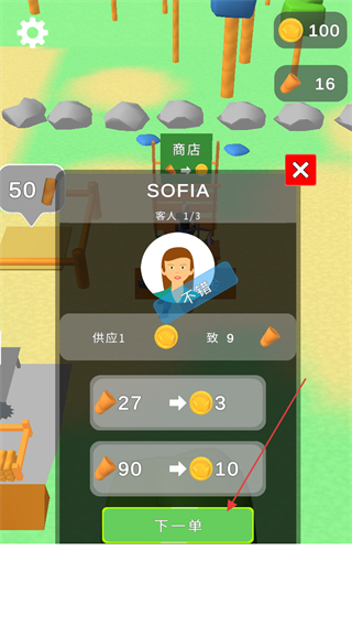 4、處理客戶訂單如SOFIA的訂單,點(diǎn)擊“下一單”繼續(xù)接單,不斷用木材換取金幣,推進(jìn)游戲進(jìn)程,提升收益。