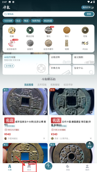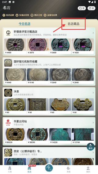 1、打開古錢幣交易類應(yīng)用,點擊底部名店選項,進入名店頁面。