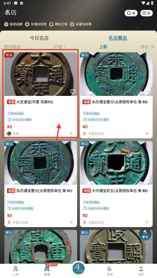 3、在名店藏品列表里,找到大定通寶華夏美82古錢幣條目,點擊進入藏品詳情頁。