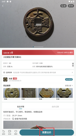 4、在藏品詳情頁,點擊我要出價按鈕,即可參與該古錢幣的出價交易。