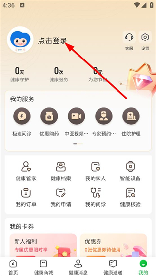 3、在個(gè)人中心頁(yè)面,點(diǎn)擊點(diǎn)擊登錄,進(jìn)入登錄/注冊(cè)頁(yè)面。