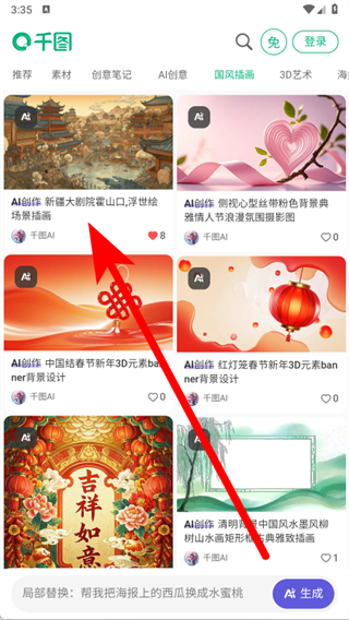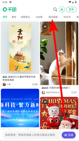 1、打開(kāi)千圖網(wǎng),點(diǎn)擊頂部國(guó)風(fēng)插畫(huà)分類標(biāo)簽,進(jìn)入國(guó)風(fēng)插畫(huà)資源專區(qū)。