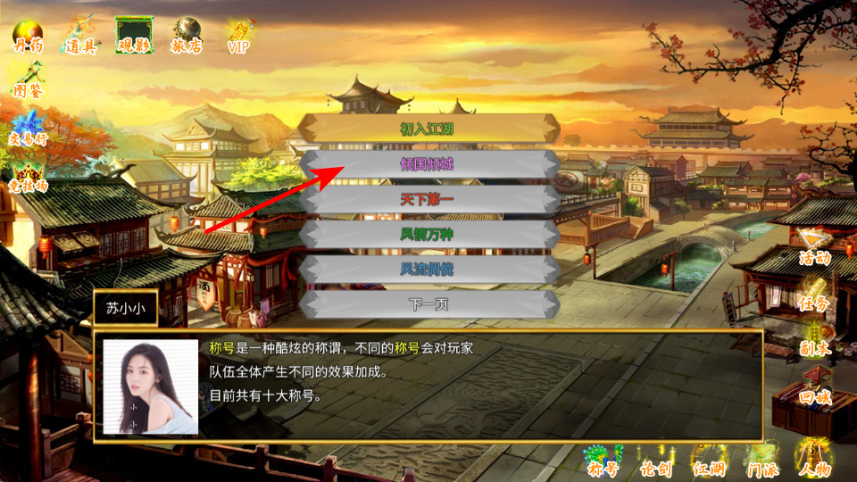 1、進入游戲后,選擇傾國傾城稱號,這是提升角色外觀與屬性的關(guān)鍵操作,選擇后可獲得稱號帶來的全體效果加成。