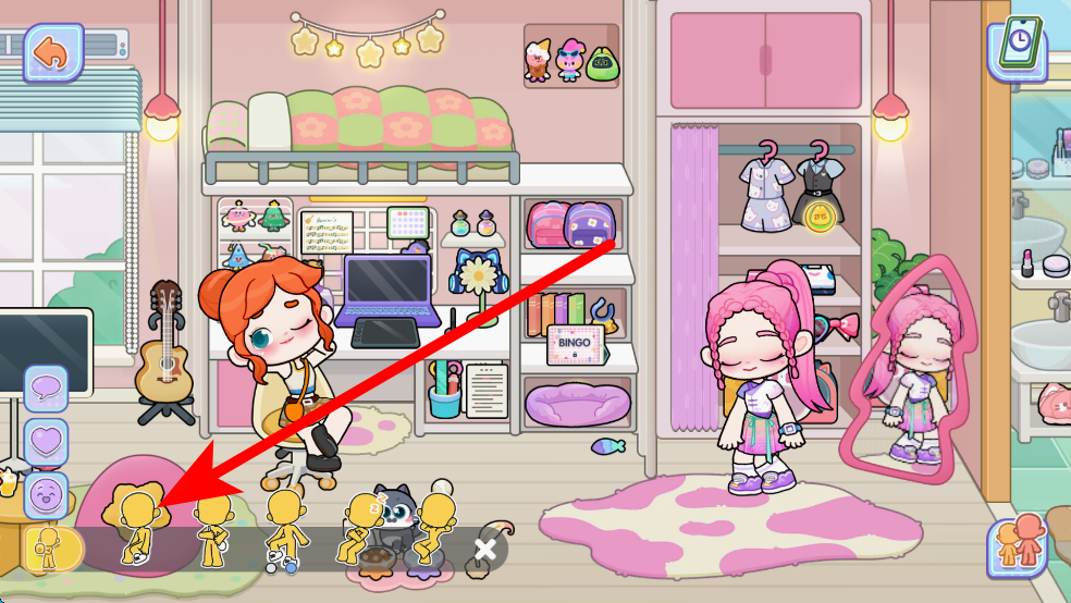 3、可切換角色的動作姿態(tài),比如選擇坐姿、站姿等,還能在衣柜前挑選衣物、配飾,為角色搭配出個性穿搭。