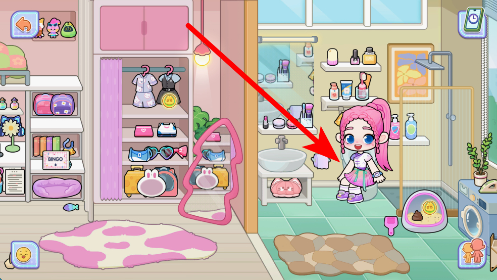 4、可讓角色坐在馬桶上,與洗手池旁的洗漱用品互動,也能觀察寵物貓砂盆等設(shè)施,感受真實的生活細(xì)節(jié)。