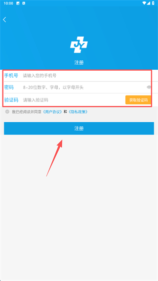 4、在注冊(cè)頁(yè)面,輸入手機(jī)號(hào)、密碼和驗(yàn)證碼后,點(diǎn)擊注冊(cè)按鈕,完成賬號(hào)注冊(cè)操作。