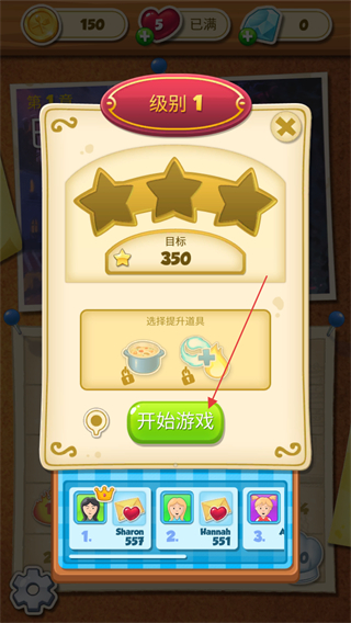 1、點(diǎn)擊開(kāi)始游戲進(jìn)入級(jí)別1,目標(biāo)分?jǐn)?shù)350,可選擇升級(jí)道具助力。