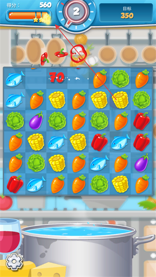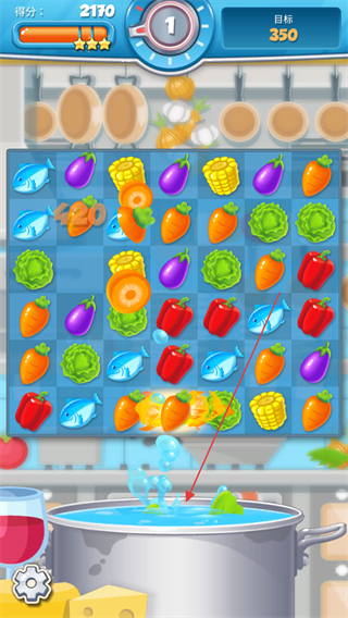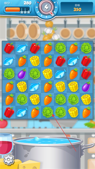 4、消除的元素會(huì)落入鍋中,持續(xù)消除積累高分,完成目標(biāo)分?jǐn)?shù)即可通關(guān)。