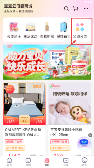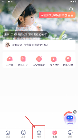 1、打開母嬰類應(yīng)用,點(diǎn)擊底部商城選項(xiàng),進(jìn)入商城頁(yè)面。