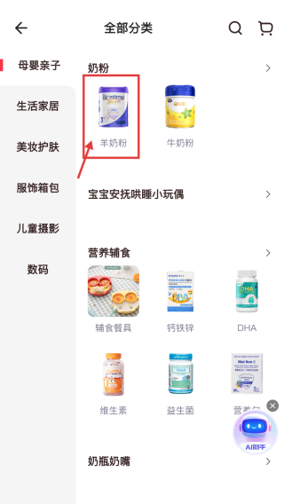 3、在商品分類列表里,找到羊奶粉分類條目,點(diǎn)擊進(jìn)入羊奶粉商品列表頁(yè)。
