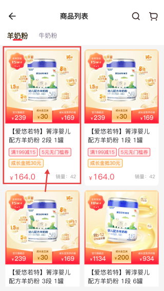 4、在羊奶粉商品列表頁(yè),即可查看羊奶粉類商品,如愛悠若特菁淳嬰兒配方羊奶粉2段1罐等。