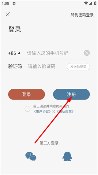 3、在登錄注冊頁面,點擊注冊,進(jìn)入注冊信息填寫頁面。