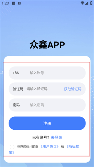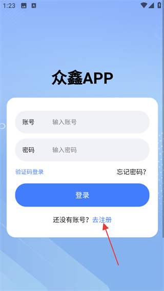 3、在登錄賬號(hào)操作頁(yè)面,點(diǎn)擊去注冊(cè)可進(jìn)入眾鑫注冊(cè)頁(yè)面。