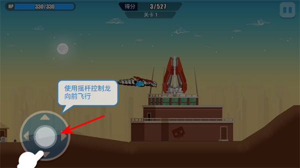 1、進(jìn)入游戲后,使用搖桿控制機(jī)械龍向前飛行,這是探索關(guān)卡的關(guān)鍵操作,操控機(jī)械龍移動(dòng)。