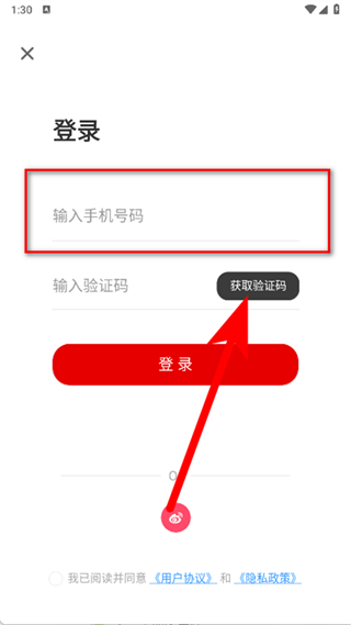 3、在登錄界面,輸入手機(jī)號(hào)碼,點(diǎn)擊獲取驗(yàn)證碼。