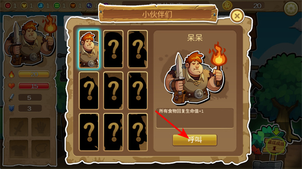 1、進入游戲后,點擊呼叫按鈕招募伙伴呆呆,這是提升探索能力的關(guān)鍵操作的增益效果,增強能力。
