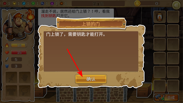 4、遇到上鎖的門時點擊確認,這是明確解謎目標的基礎(chǔ)操作,確認后需尋找鑰匙解鎖,繼續(xù)深入地牢探索。