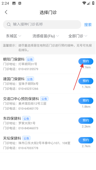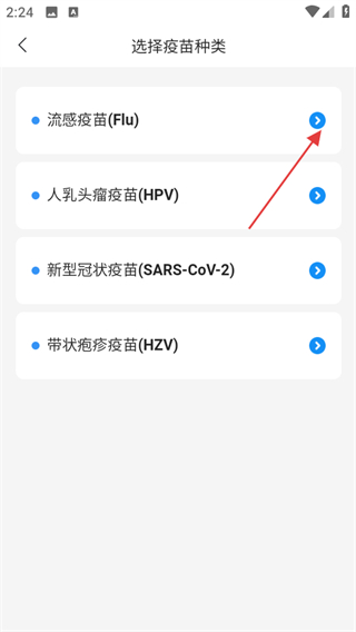2、在選擇疫苗種類頁面,點擊需要的疫苗如流感疫苗,可進入選擇門診頁面。