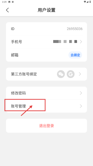 3、在用戶設(shè)置頁面,點擊賬號管理選項,進(jìn)入賬號管理頁面。