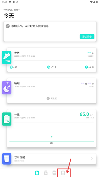 1、打開健康管理類應(yīng)用,點(diǎn)擊個人中心圖標(biāo),進(jìn)入個人中心頁面。