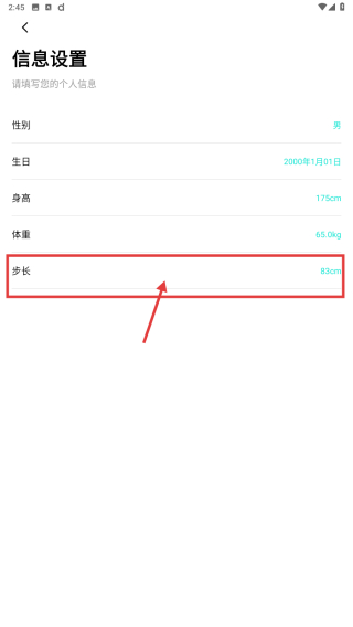 3、在信息設(shè)置頁面,點(diǎn)擊步長選項(xiàng),進(jìn)入步長選擇頁面。
