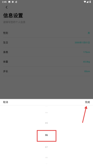 4、在步長選擇頁面,選擇合適的步長數(shù)值后點(diǎn)擊完成,完成步長的設(shè)置操作。