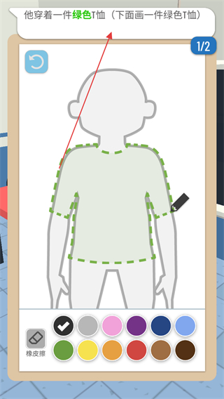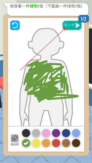 1、根據題目提示,選擇對應顏色如綠色,在指定區(qū)域繪制衣物如綠色T恤。